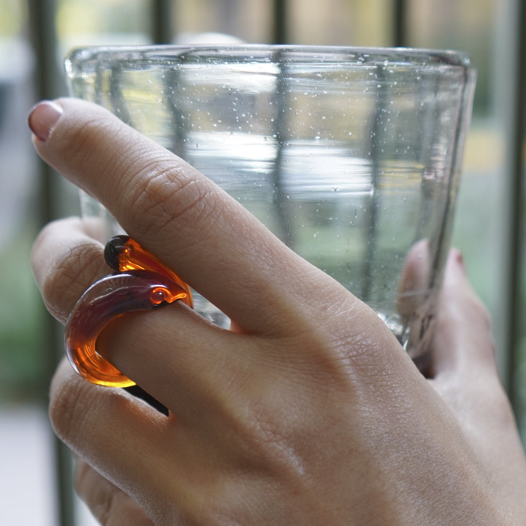 Handcrafted in recycled glass, the Anchovy Ring wraps around the finger with a bold, fluid silhouette.A playful piece inspired by shared plates and long dinners smooth, sculptural, and slightly ironic. Because sometimes being a little fishy is the whole point. 🐟